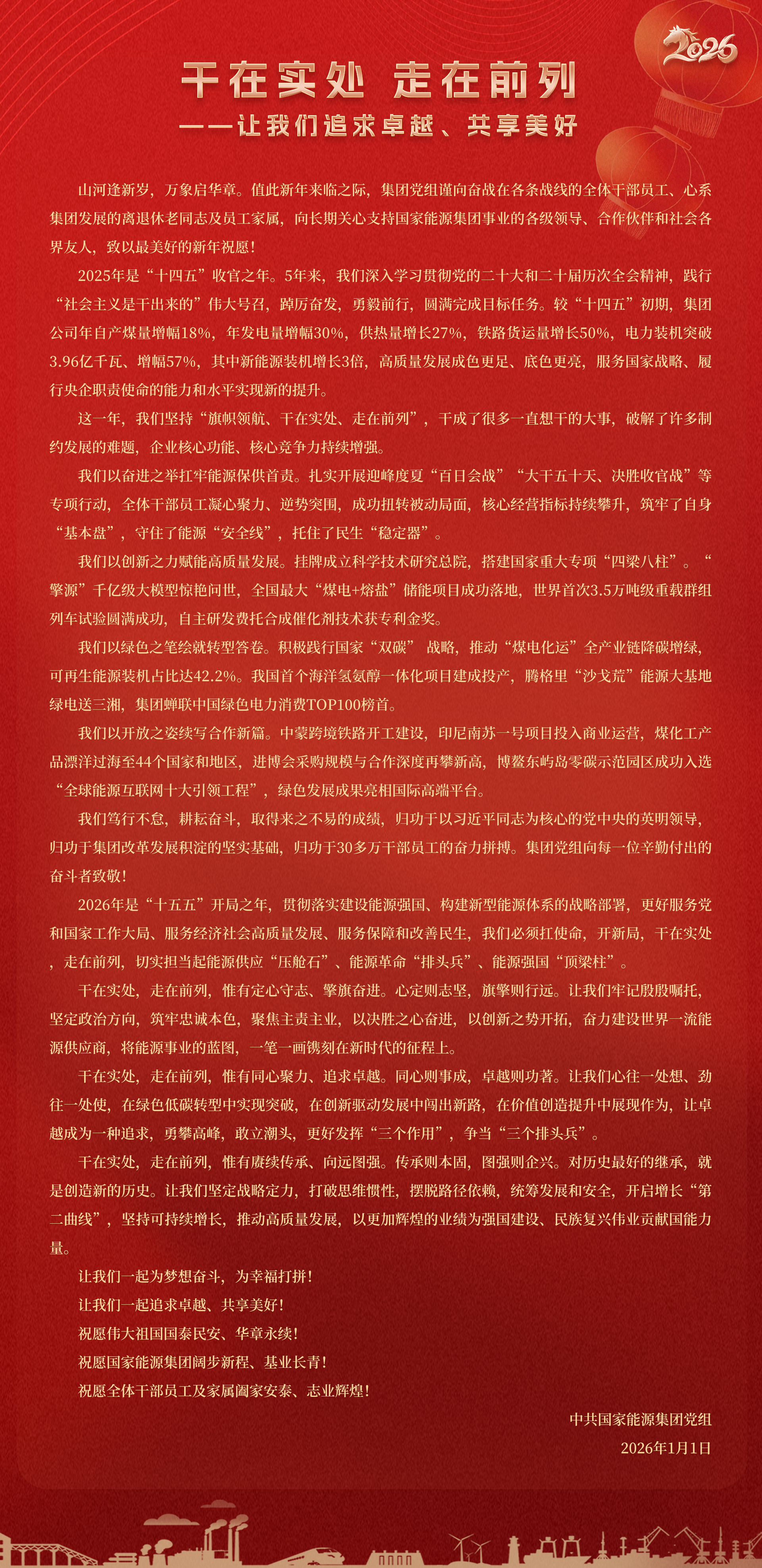 國家能源集團(tuán)胸懷“國之大者”,增產(chǎn)增供、穩(wěn)價穩(wěn)市,積極服從服務(wù)國家戰(zhàn)略、保障國家能源安全、助力國民經(jīng)濟(jì)穩(wěn)增長,推動煤炭安全綠色智能、煤電清潔高效穩(wěn)定、現(xiàn)代煤化工高端多元低碳、運輸物流協(xié)同一體、新能源多元創(chuàng)新規(guī)模化發(fā)展,全力擔(dān)當(dāng)能源強(qiáng)國頂梁柱,能源供應(yīng)壓艙石,能源革命排頭兵。